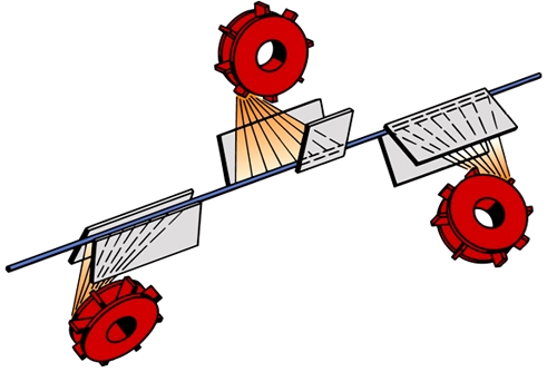 3.我公司將線材拋丸機的箱式外置拋丸器清理室,改為內(nèi)置式拋丸器清理室,彈丸近距離打擊在線材工件上,大大增加了清理除銹效率、效果。四臺拋丸器兩兩間隔180度布置,增強了彈丸清理的線材的均勻性和全包圍性,解決了工件在清理過程中出現(xiàn)“陰陽面”問題。
